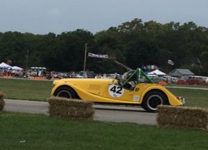 [Two MOGSouth Members flew both the Morgan and MOGSouth flags on the 2017 race track in Put-In- Bay Ohio.  This report (and the pictures) is from Rick Frazee.   Rick is in the yellow car in the pictures.   He and Jim Besst did battle with the other race cars and it would appear hay bales.  I have yet to get there but will find a way some time in the future.  Mark]