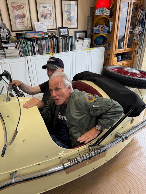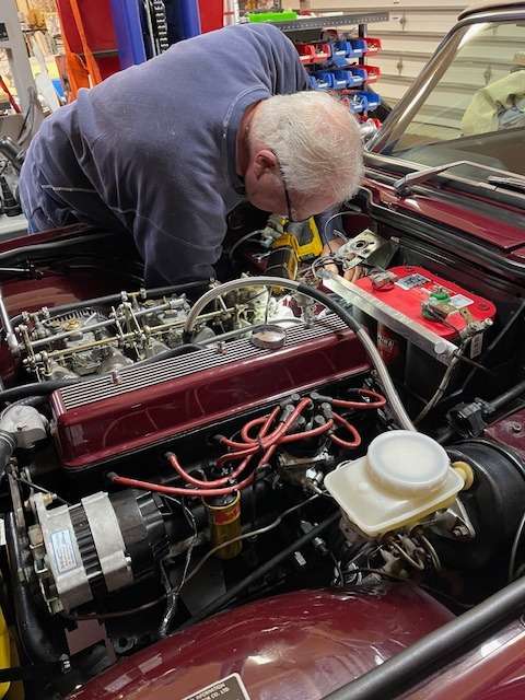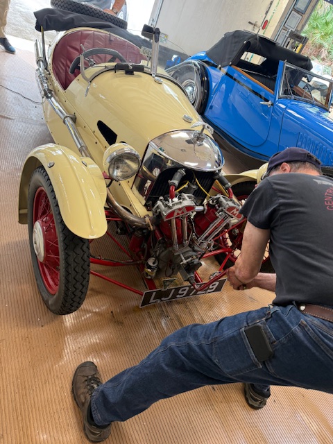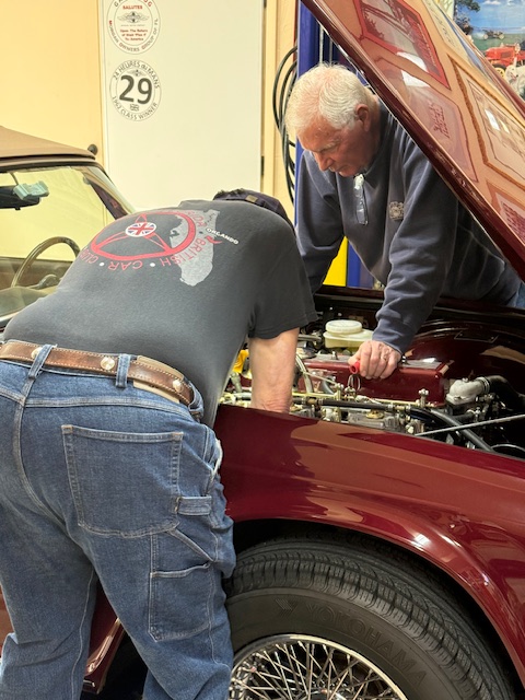 Nothing monumental on the to-do list today! A TR6 starter motor that needed to be installed (took all day??). The headlights on the MGB had to have their alignment checked. (I have this old Morgan factory photo showing a chalk board with two circles (?) used for aligning headlights. Don’t worry!! We used something a bit more modern today!! and Bob had a whining rear end. Or was it the car’s rear end?? Ok, so no bad jokes about the rear end thing!! I hear whining rear ends are quite common? Why? Not going there!!